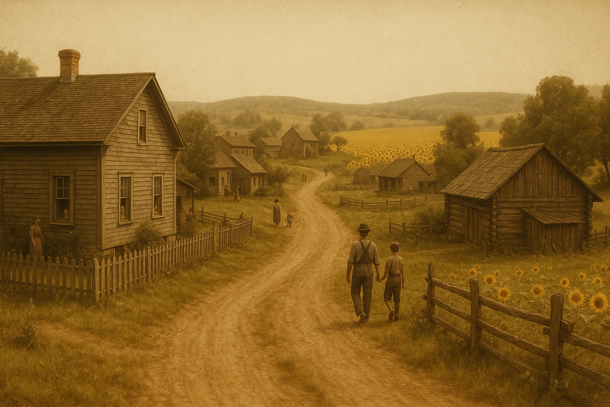 И вот тут он их увидел. Старые, покосившиеся постройки, едва видимые на горизонте, чёрными пятнами выделялись среди золотого поля.