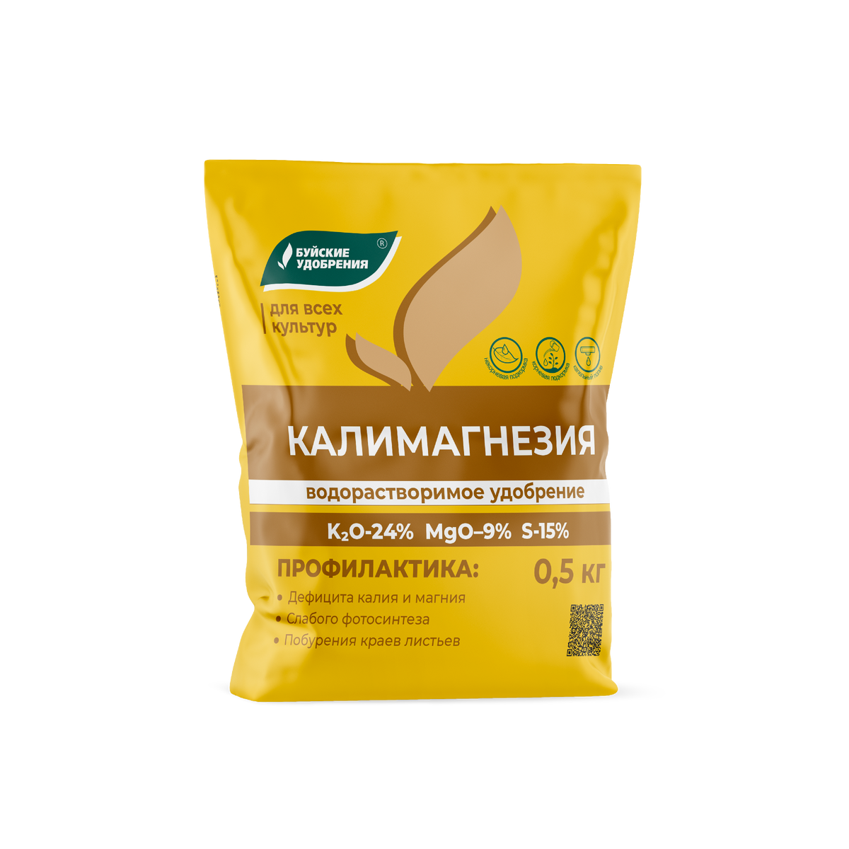 Калимагнезия — это «скорая помощь» и инструмент для повышения качества урожая. Её главная ценность — быстрое устранение дефицита магния и комплексная поддержка растения в самые ответственные периоды (цветение, налив плодов) за счет синергии калия, магния и серы. Используйте её для полива и опрыскивания, когда нужно быстро дать растениям доступ к этим элементам, особенно на бедных магнием почвах и для культур, требовательных к качеству урожая (томаты, огурцы, виноград, ягодные кустарники). Краткая характеристика: Состав: K₂O - 24% (калий), MgO - 9% (магний), S - 15% (сера). Химическая основа: представляет собой смесь очищенного от примесей сульфата калия (K₂SO₄) и сульфата магния (MgSO₄x7H2O), оба компонента полностью водорастворимы. Внешний вид: кристаллы от белого до желтовато-серого цвета. Растворимость: очень хорошая, идеально подходит для капельного полива, приготовления рабочих растворов для корневых и особенно для внекорневых подкормок. Ключевое преимущество: одновременный источн