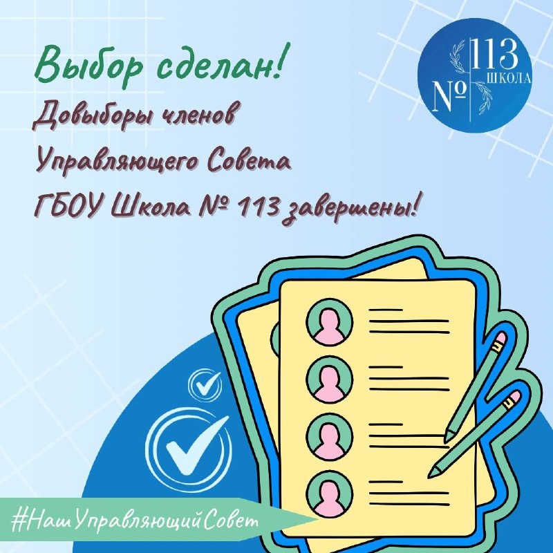 🗳️ Дорогие ребята и уважаемые родители (законные представители)! Довыборы в Управляющий Совет ГБОУ Школа № 113 завершены! 🤝 Выражаем искреннюю благодарность всем избирателям и кандидатам за вашу активную жизненную позицию, заинтересованность в развитии школы и стремление вносить вклад в общее дело. Рады сообщить итоги голосования! По итогам проведения общих собраний: 🔹 13.11.2025 — среди обучающихся старше 14 лет в корпусе «Вектор», 🔹 12.11.2025 — среди работников в корпусах «Имрус», «Солнышко» и «Звёздочка», 🔹 13–14.11.2025 — среди родителей в корпусах «Малинка», «Медуница», «Солнышко» и «Звёздочка». В состав Управляющего Совета избраны: 👧🏼 От обучающихся: ▪️Василиса Б., 9 «Н» класс 👩🏫 От работников: ▪️ Жданова Елена Лазаревна ▪️ Сорокина Олеся Михайловна 👨👩👧 От родителей: ▪️ Абраменко Ольга Владимировна ▪️ Иванов Сергей Николаевич 🎉 Поздравляем новых членов Управляющего Совета! Желаем успешной и продуктивной работы, вдохновения, смелых инициатив, конструктивны