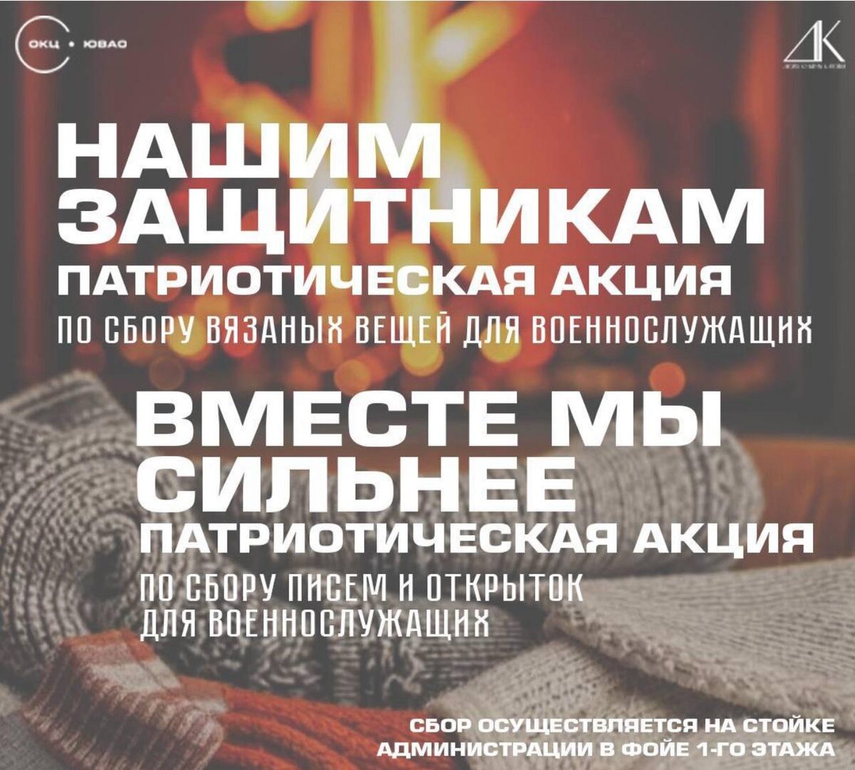 📩 С 1 по 30 ноября Дворец культуры "Капотня" приглашает всех желающих принять участие в патриотических акциях: "Нашим защитникам" и "Вместе мы сильнее". В рамках акций участники могут принести: - носки, - шапки и перчатки, - созданные своими руками открытки, - письма и рисунки. Собранные вещи будут переданы военнослужащим. Вещи и открытки можно оставить на стойке у администраторов в фойе 1-ого этажа Дворца культуры "Капотня". Возрастная категория: 0+ #культураМосквы #культураЮВАО #ОКЦЮВАО #московскиекультурныецентры #дккапотня