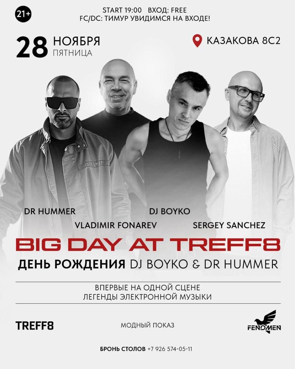 28 ноября 19:00 BIG DAY AT TREFF8: Друзья, готовьтесь к ночной феерии звука, драйва и эмоций! В эту особенную ночь мы празднуем дни рождения DJ BOYKO & DR.HUMMER Впервые на одной сцене выступят титаны электронной музыки: VLADIMIR FONAREV, DJ BOYKO, SERGEY SANCHEZ и Dr. Hummer. Это будет незабываемая ночь с мощным звуком, модным показом, театральным маскарадом, бешеной энергией. LINE-UP MAIN STAGE: 💥 Fonarev 💥 DJ.Boyko 💥 Sergey Sanchez 💥 Dr. Hummer 💥Fenomenальная поддержка: • Zedjue • Archikilla • Dj Sokol • MaxMini • Sirin • Dary ANN • AKOP • Meskina • Constantin • VASINN • BelyakovDj Сменить атмосферу и передохнуть в Chillout STAGE вам помогут 20!! Артистов FENOMEN: • DJ Norell • Lana Solleo • Stepanova • Mistress Polevaya • DAKKORD • Zvoznikov • MAIYA • ViiK • Dein Raum • ROSICH • JShira • Sufiya • STAS • AntiDmit • SODA • DJ ValovRA • GRAPHL MILCHEVSKY • Katerina Sound • Nativa • Puella Noise У вас есть всего лишь одна ночь почувствовать, как звучит - ЛЕГЕНДА. ДАТА: 28