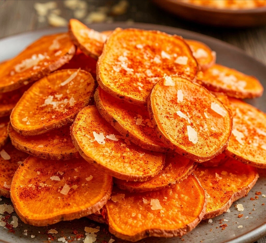 БЫСТРЫЙ И ПОЛЕЗНЫЙ ПЕРЕКУС — ЧИПСЫ ИЗ БАТАТА С КОПЧЕНОЙ ПАПРИКОЙ И ПАРМЕЗАНОМ Мяу, мои пушистые хрустики! 😺 А вы знали, что чипсы могут быть полезными? Да-да, если приготовить их из батата! Эти чипсы — сладковатые, с дымком паприки и соленым пармезаном. Они такие вкусные, что оторваться невозможно, а готовятся — проще простого! 🍠🧀 ЧИПСЫ ИЗ БАТАТА С КОПЧЕНОЙ ПАПРИКОЙ И ПАРМЕЗАНОМ ИНГРЕДИЕНТЫ: 🧾 · Батат — 1 крупный (около 500 г) · Оливковое масло — 2 ст. ложки · Копченая паприка — 1 ч. ложка · Сушеный чеснок — 0.5 ч. ложки · Соль — по вкусу · Тертый пармезан — 3-4 ст. ложки ВРЕМЯ ПРИГОТОВЛЕНИЯ: ⏰ 30 минут СЛОЖНОСТЬ:🐾 Проще некуда ПОШАГОВЫЙ РЕЦЕПТ: 👩🍳 1. Разогрев духовки: Разогрейте духовку до 200°C. Застелите противень пергаментом. 2. Подготовка батата: Батат вымойте и нарежьте очень тонкими кружочками. 3. Маринад: В миске смешайте масло, паприку, чеснок и соль. Добавьте ломтики батата и перемешайте. 4. Выкладка: Разложите ломтики на противне в один слой. 5. Выпечка: Выпека
