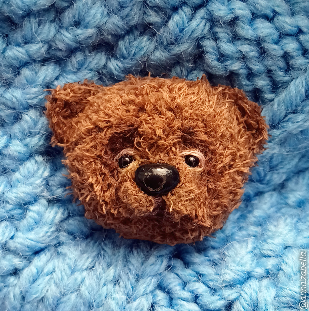 🧶 Материалы Для работы я использовала пушистую пряжу типа «травка», которая даёт эффект меха. Благодаря ней игрушка получилась особенно мягкой и «живой» — будто маленький плюшевый зверёк. Чтобы сделать лицо более выразительным, я использовала масляные краски для лёгкой тонировки: затемнила участки вокруг глаз, выделила мордочку и аккуратно подчеркнула объём. 🔹 Игрушка состоит из четырёх деталей: 🐻 Носик я слепила из полимерной глины, а глазки сделала из бусинок. И носик, и глаза покрыты лаком — поэтому они нежно поблёскивают на свету и придают мишке особое очарование. На обратной стороне броши закреплена прочая металлическая застёжка-булавка, так что мишка легко и над