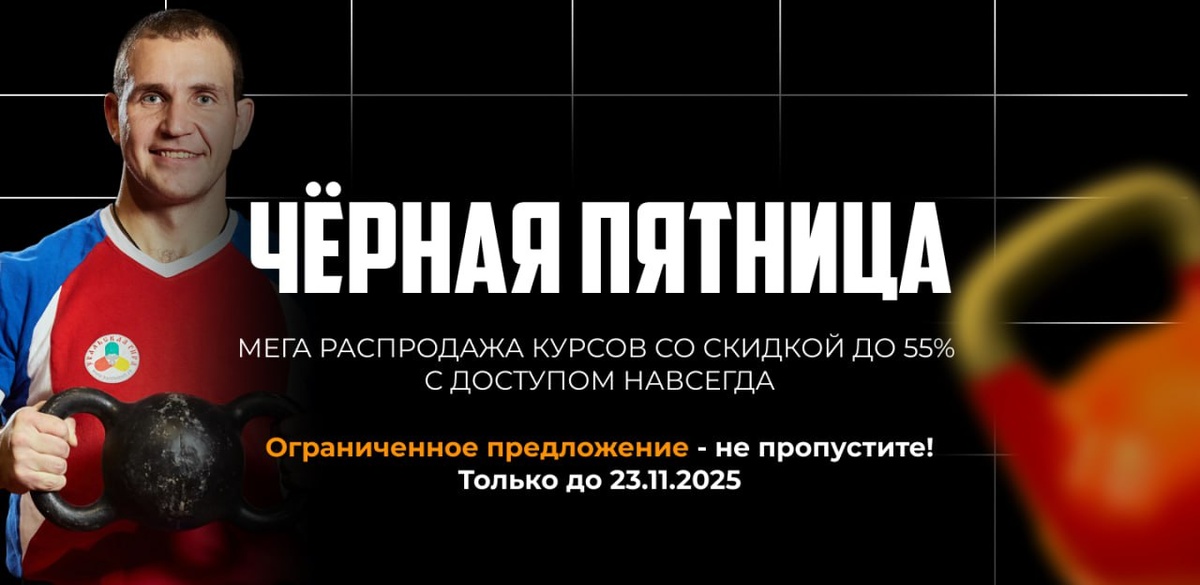 Эта неделя это ваша возможность стать здоровее, сильнее и выносливее на самых выгодных условиях. В Академии тренировок с гирями начинается Черная Пятница📉 Продлится она с 17 по 23 ноября включительно📆 В рамках этой акции тебя ждут скидки на наши курсы от 13 до 55% Курсы, которые можно выгодно приобрести, рассчитаны как на новичков и любителей, так и на тех, кто с опытом и амбициями, как в жизни, так и в гиревом спорте. Все подробности на специальном сайте акции. Переходи по ссылке, смотри и выбирай нужно. Важно! После Черной Пятницы цены на все обучение в Академии вырастут. Цены сейчас - самые выгодные. Потом будет заметно дороже. ➡️УЗНАТЬ ПОДРОБНОСТИ