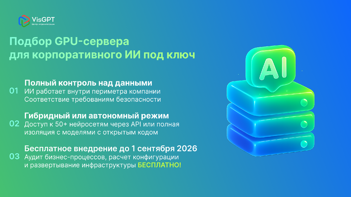 VisGPT предоставляет комплексное решение: от анализа потребностей до запуска функционирующей инфраструктуры с нейросетями. Инвестиции в собственный сервер с GPU формируют долгосрочный актив, обеспечивающий технологическую независимость и защиту критичных данных организации. Это не расходная статья, а построение собственной AI-платформы для бизнеса на русском языке с полным контролем над процессами.
