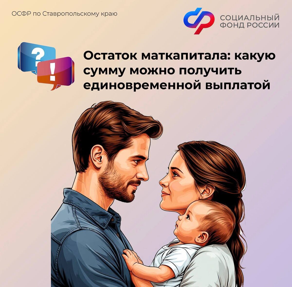🧑🧑🧒🧒Семьи Ставрополья могут получить остаток средств материнского капитала единовременной выплатой, если сумма на сертификате не
