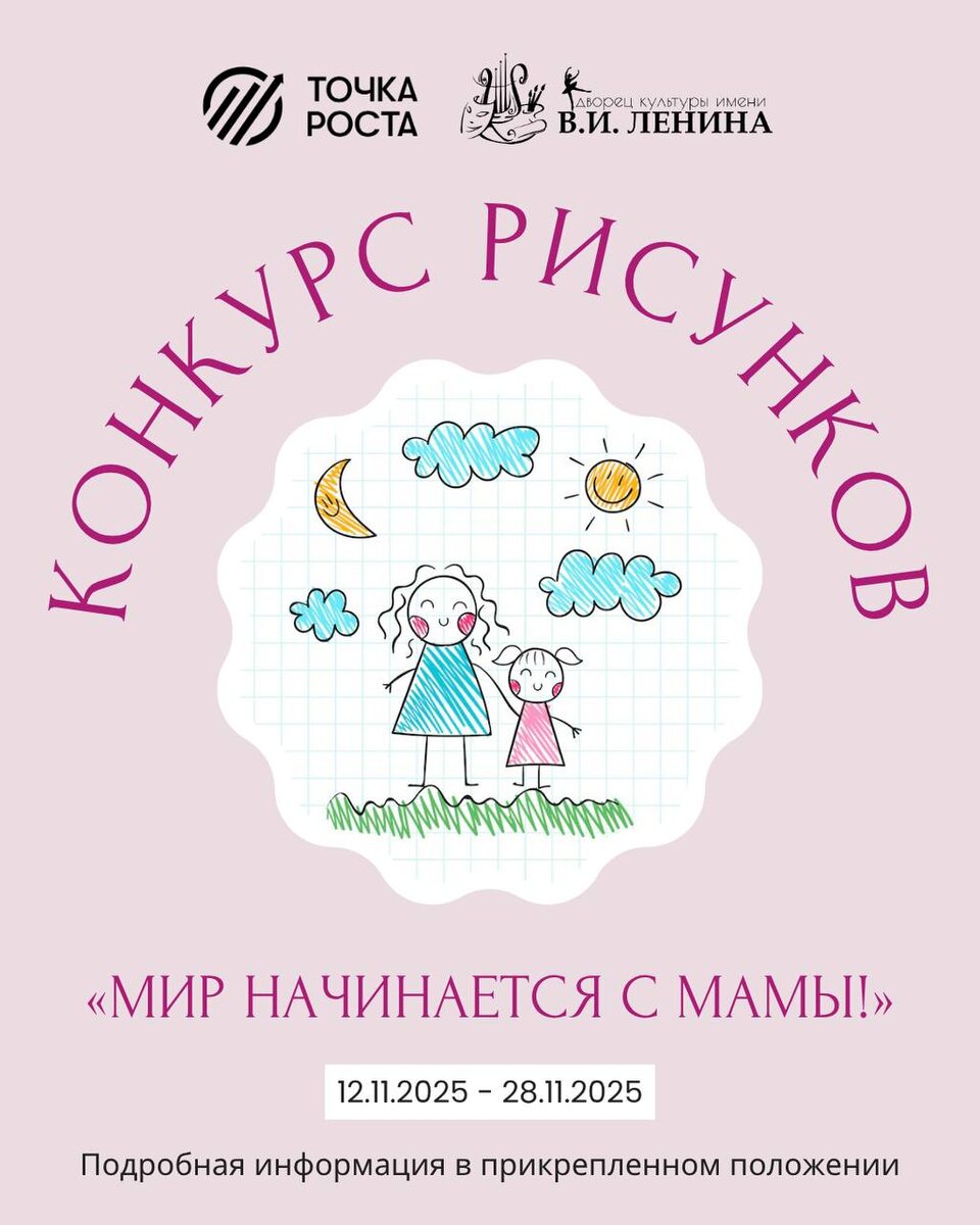 ✨ Конкурс рисунков «Мир начинается с Мамы!»🎨 📅 Сроки приёма работ совпадают с работой выставки: с 12 ноября по 28 ноября 2025 года 👉Категории: I группа: до 6 лет; II группа: от 7 до 10 лет; III группа: от 11 до 16 лет. 👉Размер А3, А4 Печатная этикетка (6*4см) в правом нижнем углу : ФИО, возраст, название работы, контакт телефон) Лучшие работы будут отмечены дипломами и памятными подарками🎁 ❗До 1 декабря нужно забрать работы 🚫 Возраст: 6+ 🏢 ДК им. В.И. Ленина 📍 г. Серпухов, ул. Физкультурая, д.16 ⭐Поддержать канал голосом 💰 Канал Вакансии Серпухова ✅ Мероприятия Серпухов https://dzen.ru/id/66f01c6eb4c6fe60c9ca1608 http://vk.com/serpukhov_events http://dzen.ru/serpukhov_events