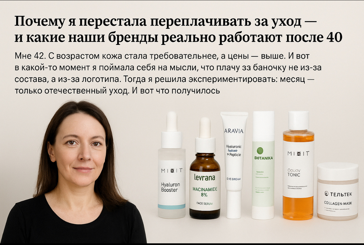 Мне 42, и моя кожа в последние годы стала той самой «требовательной королевой», которая реагирует на всё: воздух, воду, стресс, недосып, солнечный луч под неправильным углом. И в какой-то момент я поймала себя на странном ощущении: покупая дорогой крем, я радовалась не составу, а имени бренда. Словно платила не за уход, а за принадлежность к красивой истории на упаковке. И тогда я решила провести эксперимент. Очень простой: месяц пользоваться только российской косметикой. Без люкса, без громких маркетинговых обещаний. Только локальные бренды, доступные в обычных магазинах и аптеках. Я честно взяла продукты от MIXIT, Levrana, ARAVIA Professional, Geltek и Botavikos — и начала тестировать. И вот что получилось. Как я поняла, что переплачиваю До 40 я не особо задумывалась о составе — главное, чтобы баночка нравилась. Но после 40+ кожа становится более реактивной: то сохнет, то лоснится, то «теряет тонус», то резко краснеет. Со временем я заметила: дорогие средства работают… но не лучше, ч