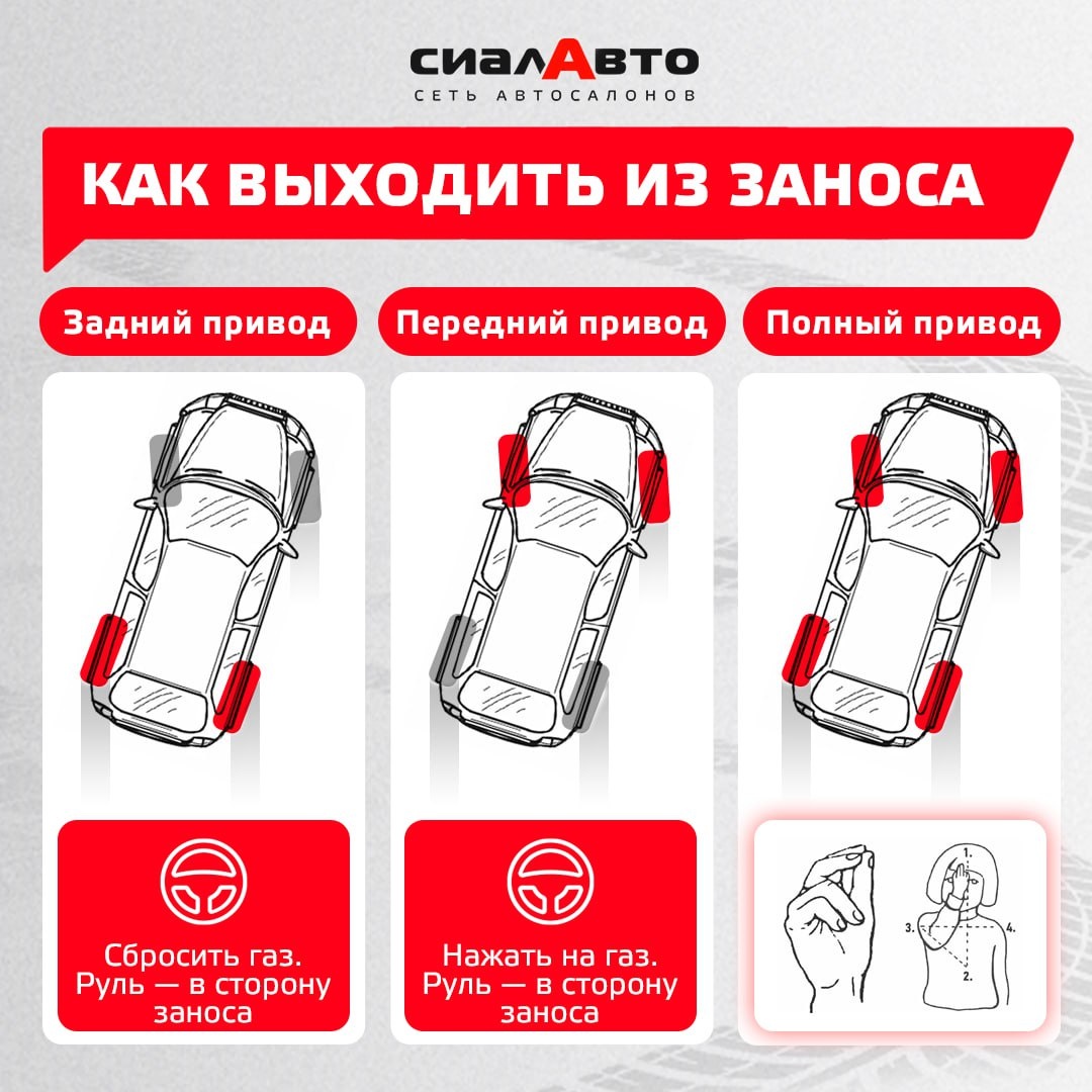 Холода наступают: предлагаем краткую инструкцию на случай, если машину занесло: 1️⃣ Не паникуйте. Резкие движения - ваш главный враг. 2️⃣ Смотрите вперед туда, куда хотите направить машину. 3️⃣ Плавно поверните руль в сторону заноса (если зад уходит влево - руль влево). Действуйте по схеме выхода из заноса для разных приводов: Задний - плавно сбрасывайте газ. Передний - плавно добавляйте газ. Полный - удерживайте газ. Лучшая защита - исправный автомобиль. А мы в СИАЛАВТО поможем его подготовить к любым дорогам. Берегите себя! ❤️