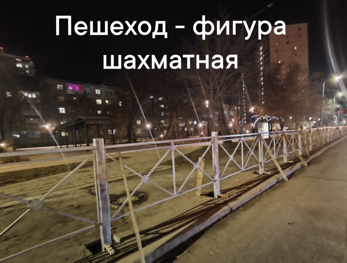 Пешеход - фигура шахматная Ходить должен только прямо, и поворачивать под прямым углом. А сам он не догадается, стоит контроль ослабить, как тут же прыгает под машину, каждый! Возможно именно такие мысли приходят на ум чиновникам, расставляющим заборы. Раз в году появляются новые бесполезные железяки. Зато бюджет потрачен. А нужен тут забор или нет - неважно. А нам важно. Впереди зима и забор будет мешать уборке снега. Потом лето и у забора скопится пыль и грязь. Он же мешает чистить улицы. В Москве такое давно не встретишь, а мы раз в году сдуваем пыль со старой таблички, чтобы напомнить мэру и чиновникам, где забор нужен, а где нет. Тоже пользуйтесь. И пишите чтобы демонтировали ненужные секции. Сохраняйте табличку себе, делитесь с друзьями. Мы не пешки, да и под машины не кидается.