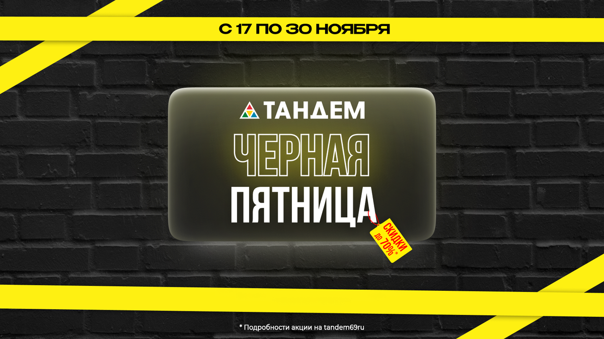 все давно этого хотели… Чёрная пятница в торговом комплексе Тандем. С 17 по 30 ноября 2025 года скидки на мебель, отделку и интерьер до 70%!!! Все уже здесь.. А ты? · Строительные и отделочные материалы (1 этаж): 9:00-20:00 · Мебельный центр (2 и 3 этажи): 10:00-20:00 · Ситилинк: 09 - 21: 00 / ДНС: 09:00 - 21:00 г.Ярославль, ул. Полушкина роща, д. 9 стр. 13, 14. #дайджестскидокТК76