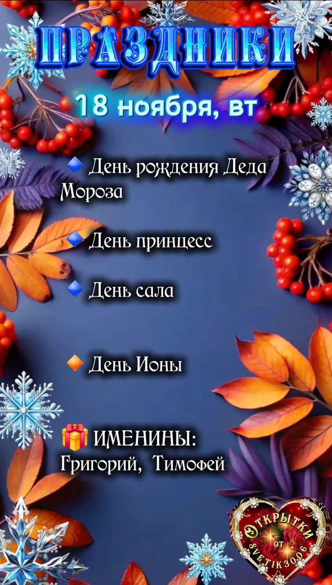 🔸️День Ионы. На Руси девицы обычно молили Бога о том, чтобы выйти замуж, чтобы жить счастливо, и просили послать им хороших мужей. А чтобы быстрее сбылось, девушки на заре выходили во двор и разбрасывали вокруг домов мелкие монетки и небольшие вещицы, сделанные своими руками. 🔹️День рождения Деда Мороза. 18 ноября в России официально празднуют день рождения Деда Мороза. Сколько лет зимнему волшебнику — неизвестно, но точно, что более 2000 лет. Дату дня рождения Деда Мороза придумали дети, поскольку именно 18 ноября на его вотчине — в Великом Устюге — в свои права вступает настоящая зима, и ударяют морозы.