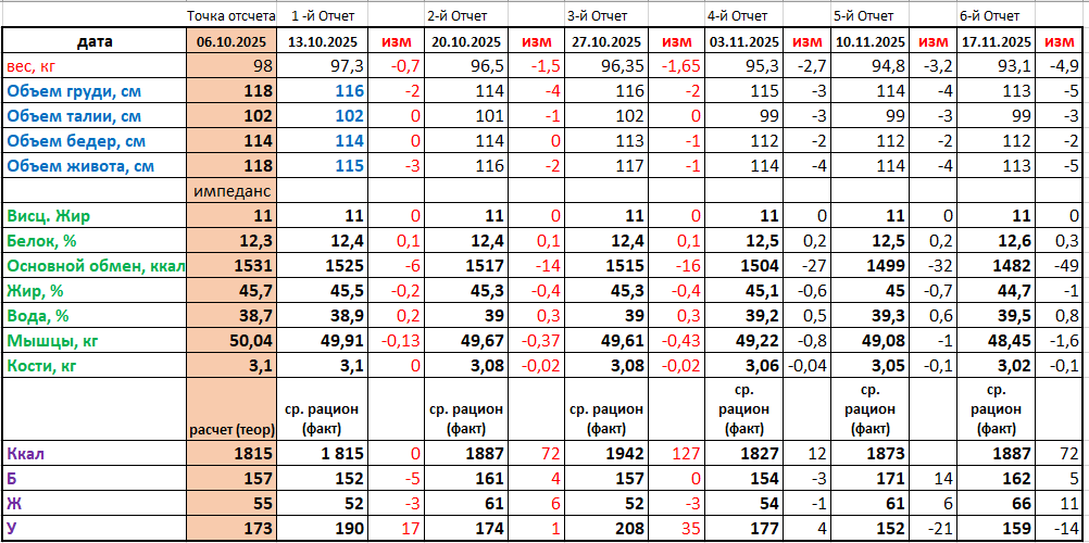 Ключевой ориентир — объёмы: Это говорит о равномерной потере жировой ткани, а не мышц. 💡 Размышления: Домашний импеданс не отслеживает мышцы точно, особенно при колебаниях воды и гликогена. Буду доверять телу больше, чем цифрам на экране. Возможно скоро выложу фото "ДО" и на следующую контрольную точку для визуала. 📌 За что себя стоит похвалить: