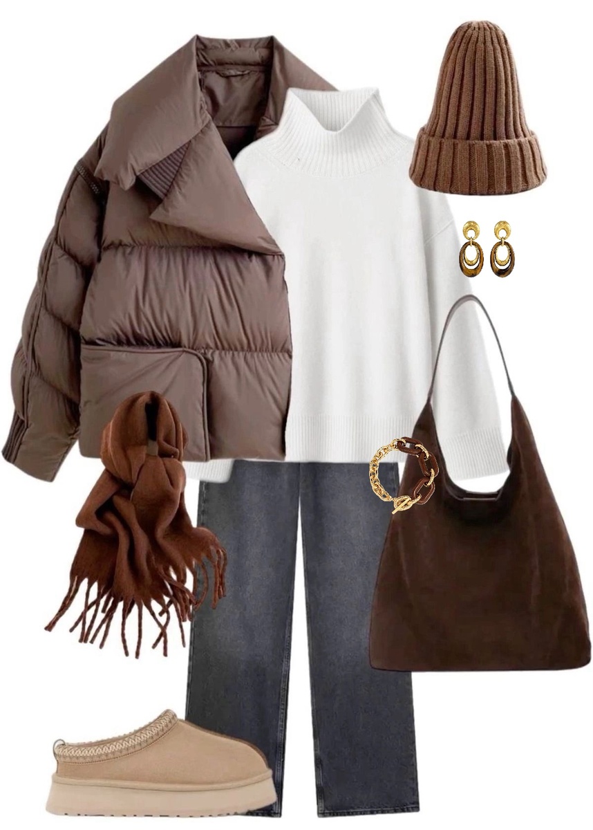 Всем привет! Благодарю, что заглянули на канал. Рубрика: мода и стиль На канале 👉ТГ👈 много интересных подборок🔥 Осенью и зимой вполне реально переосмыслить свой повседневный стиль и добавить в него больше уюта, практичности и индивидуальности. Современный casual уже давно не сводится к джинсам и свитеру - сейчас это гармония комфорта, функциональности и аккуратного внешнего вида. Мягкие фактуры, многослойность и нейтральные оттенки сочетаются с трендовыми деталями, создавая образы, которые подойдут и для офиса, и для прогулок по городу. В этом сезоне комфорт становится главным акцентом, а стиль его естественным продолжением. Объёмный пуховик и тёплый свитер создают ощущение комфорта, джинсы прямого кроя добавляют свободы движений. Шапка и шарф из мягкой пряжи защищают от холода, а удобные угги (их можно заменить на любые ботинки или ботильоны) обеспечивают лёгкость. Сумка из замши и лаконичные аксессуары завершают образ, делая его практичным и стильным для повседневных дел. Этот осе