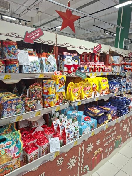 Готовые сладкие новогодние подарки начали массово продавать в магазинах. Ассортимент традиционный: сладкие наборы и всевозможные вариации на тему символа года: в 2026 году - это Лошадь. Ищем самый бюджетный сладкий подарок в обычном гипермаркете, но не забываем о самом дорогом. Фаворит рейтинга самых бюджетных новогодних сладких подарков — конвертик с шоколадкой. Недорого, мило и в целом хорошо, так как много сладкого вредно. Цена 79 рублей, дизайн открытки разный. Вес - 25 г. На втором месте набор кондитерских изделий за 169 рублей. Включает в себя разные конфеты, а в том числе карамельки. Вес - 150 г. Замыкает тройку лидеров набор за 229 рублей. Здесь печенье, конфеты, в том числе и шоколадные. Вес — 300 г. Мы не рассматривали сладкие новогодние фигурки в виде отдельных новогодних фигурок в стиле а-ля Дед Мороз. Всё-таки это не набор, а штучный товар.