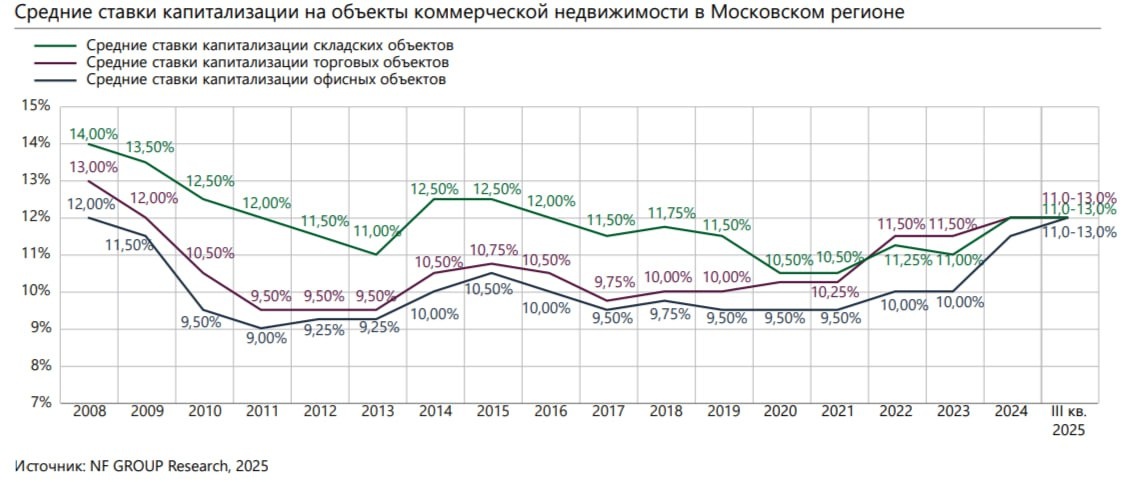 📊 NF Group выпустили свежий отчёт по инвестиционному рынку за III квартал 2025. Новость и цифры разбирал ранее вот тут. В отчете есть один график, который заставляет меня задуматься. 🎲 Итак: ключевая ставка - 16,5%(была выше), а средние ставки капитализации по всем трём классам активов (офисы, склады, торговля) - стабильно 11-13%. И самое интересное: сделки-то идут! За 9 месяцев 603 млрд рублей, из них 249 млрд в третьем квартале. ❓Почему крупные инвесторы готовы покупать активы с доходностью ниже безрисковой ставки? 🔑 Мне кажется, что причины, как и раньше, заключаются в ограничениях на вывод капитала. Так как санкции не дают вывести деньги за рубеж, «заблокированные» миллиарды создают избыточную ликвидность внутри страны. Деньги есть, а вкладывать некуда. Конкуренция за качественные активы не позволяет ставкам капитализации расти даже при высоком ключе. ☝️Ну и дефицит альтернатив. После закрытия доступа к западным финансовым рынкам крупные российские игроки ограничены в выборе