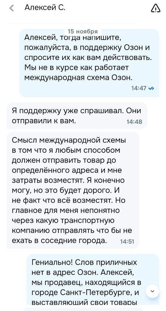 Ozon запустил международные продажи, но схему возвратов так и не продумал В чате селлеров снова всплыла больная тема: международные заказы Ozon оформлять можно, а вот вернуть товар — целый квест. И страдают в итоге все: покупатели, продавцы, и никакой внятной инструкции нет. Вот свежий пример из переписки. Покупатель из Грузии получил одобрение на возврат. Дальше — тупик. ПВЗ там — не Ozon, а партнер INEX. Товар не принимают. Отправляют «вон туда». Поддержка покупателей отправляет к продавцу. Продавец пишет в поддержку Ozon — там руками разводят. Покупатель спрашивает: «Как вернуть товар, если вы сами не знаете, куда его принимать?» А селлер отвечает уже на эмоциях, потому что его самого отправили решать международную логистику: «Мы продавец из Санкт-Петербурга, мы вообще не понимаем, как у вас там устроена международная схема. Отказаться от продаж за рубеж вы не разрешаете, а возвратами не занимаетесь. В итоге вы повернулись спиной и к нам, и к покупателям». Получается странна
