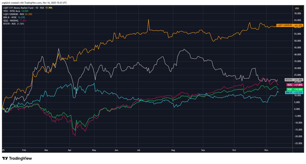 На графике мы видим результаты с начала 2025 года: ▪️ Денежный рынок РФ (по доходности аналогичен вкладам в банках) в долларовом эквиваленте: +61%; ▪️ Индексный фонд Vanguard S&P500 (VOO), под управлением которого умопомрачительная сумма $800 млрд (а у топ-3 фондов с данной стратегией под управлением 2,3 триллиона долларов): +14,5%; ▪️ Индексный фонд Invesco Trust (QQQ), инвестирующий в технологические компании из индекса NASDAQ, $400 млрд под управлением: +18%; ▪️ Корпорация Berkshire Hathaway (BRK.B) знаменитого Уоррена Баффетта с рыночной капитализацией $1,1 трлн: +12%. Обычный российский вкладчик при условии если он просто перекладывал свои деньги под ставку, близкую к ключевой, заработал многократно больше. Это связано с тем, что рубль укрепился с начала года со 113 рублей до 80 рублей. Хоть сколько-то близкий результат из крупных популярных инвестиционных стратегий смогли получить лишь инвесторы в золотые трасты (+55%) и серебряные трасты (+75%). Любые другие стратегии и результа