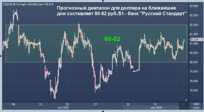 Прогнозный диапазон для доллара на ближайшие дни составляет 80-82 руб./$1 - банк "Русский Стандарт" Курс доллара к рублю расчётный, фьючерс, вечный фьючерс и межбанк. Курс евро к рублю расчётный, фьючерс, вечный фьючерс и межбанк. Курс юаня к рублю биржевой, фьючерс, вечный фьючерс и межбанк. Прогнозный диапазон для доллара на ближайшие дни составляет 80-82 руб./$1, для евро - 93-95 руб./EUR1, говорится в комментарии директора департамента операций на финансовых рынках банка "Русский Стандарт" Максима Тимошенко. На взгляд эксперта, в качестве позитивного фона вступают данные по недельной инфляции в РФ, которая показала замедление. Оптимизма российскому энергетическому рынку способен добавить рост экспорта нефти из России и Центральной Азии в сентябре на 13%, по данным ежемесячного отчета ОПЕК. "При этом не на стороне рубля - снижение нефтяных цен на фоне прогнозов ОПЕК+ по увеличению добычи в 2026 году, - указывает Тимошенко. - Доллар остается под давлением от окончания шатдауна в Соед