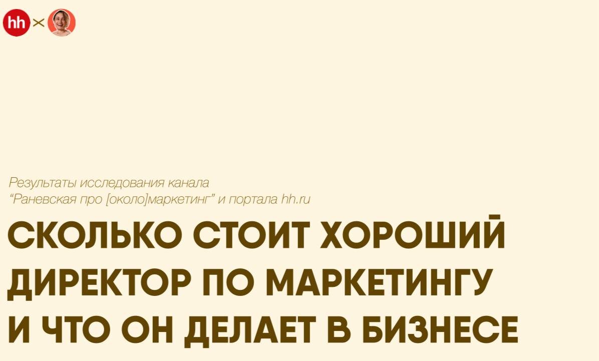 Исследование завершено Коллеги с канала https://t.me/estkontact совместно с hh.ru провели исследование реальных ЗП директоров по маркетингу. Приятно было увидеть свой небольшой канал в числе респондентов. Пусть ответным «Спасибо» с моей стороны будет поделиться проделанной работой ребят. Вот, что они сами пишут: «5 месяцев, 150 интервью, тысячи резюме… мама😅 Теперь мы точно знаем, сколько зарабатывает квалифицированный мардир — с окладом, бонусами и KPI.» Кому интересно, подпишитесь на упомянутый канал и забирайте результаты в боте по ссылке: @hhxranevskayabot