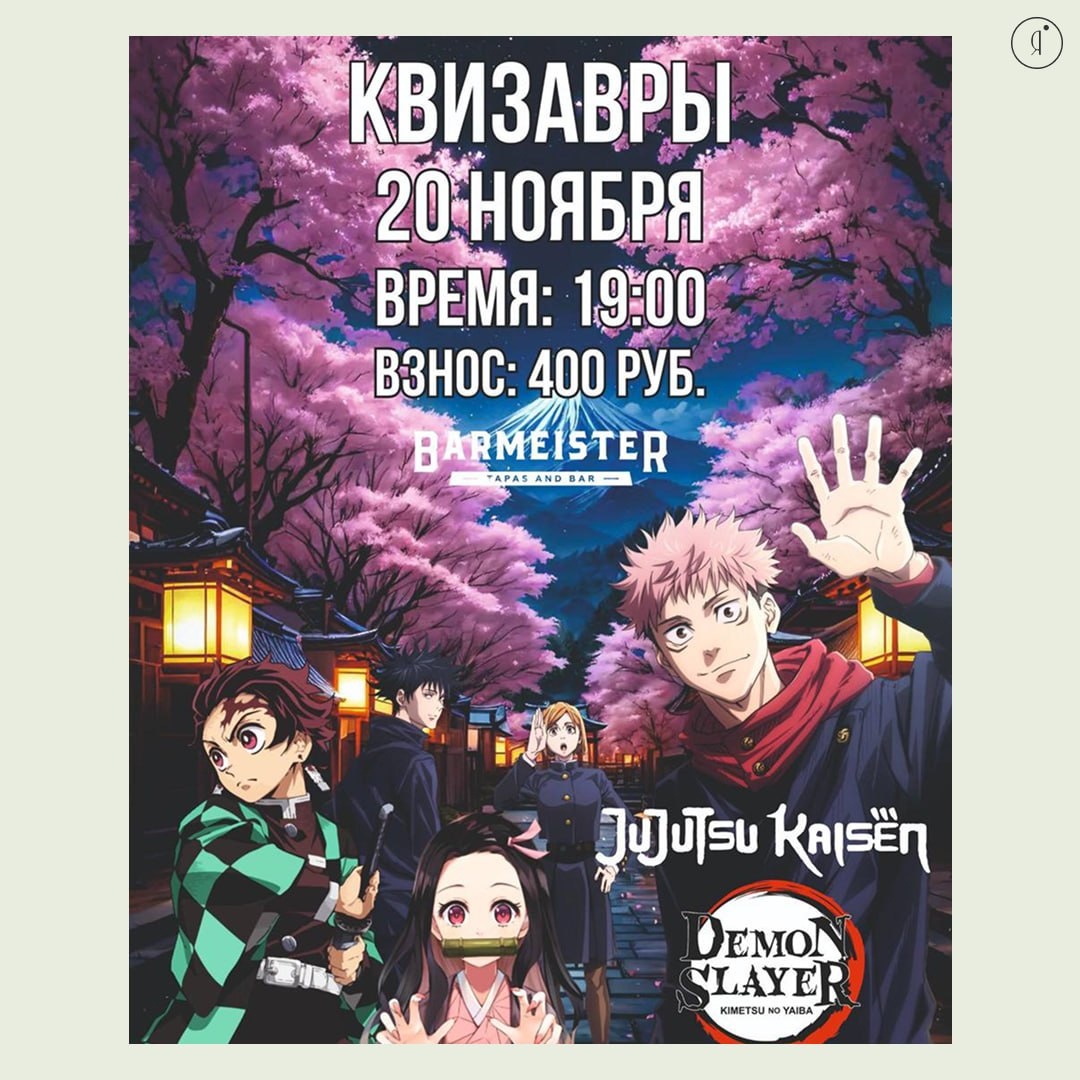 Квизавры: Аниме-битва #Вечером #Квизы Вас ждет битва по аниме «Клинок рассекающий демонов» и «Магическая битва» 😈 Мир заклятий, демонов и великих сражений. Вас ждут вопросы о героях, сюжетах, технике дыхания и приёмах проклятой энергии. Проверь, насколько вы преданы Годжо, Танжиро и их вселенным! 20 ноября | 19:00 Barmeister, Кирова, 18а Взнос: 400 руб. Запись через группу @quizavry +79142969497
