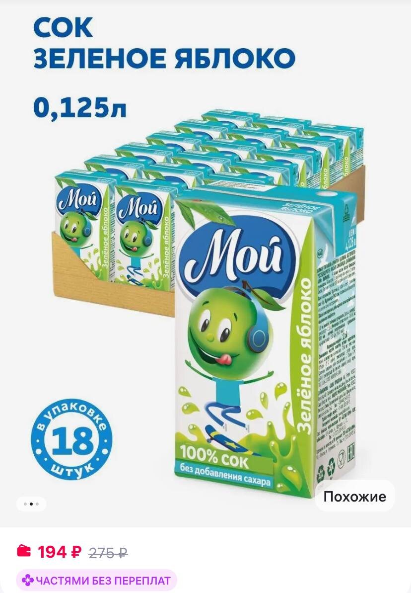 мой Сок яблочный из зеленых яблок осветленный 0,125л "Мой" 18 шт https://www.wildberries.ru/catalog/147274738/detail.aspx?size=247639724 ✅ Подписаться 🔣 Бот с промокодами