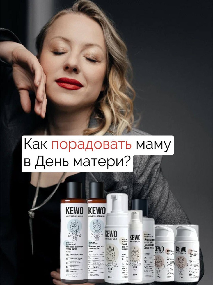 Как порадовать маму в День матери?✨ День матери уже рядом, и если хотите порадовать своих с душой — косметика KEWO реально топовый вариант 👍🏻 Я своей маме подарила полный набор из 7 средств. Люблю такие подарки, где не что-то одно, а полноценный уход с головы до пяток! Ведь зимой: • и рукам нужна защита и восстановление • и кожа на ногах зудит и сохнет • и волосы страдают из-за мороза и сухого воздуха! А что уж говорить о лице: мороз, ветер, хочется нежно очищать настрадавшееся лицо, а потом восстанавливать урон правильными компонентами, да ещё обязательно с анти-эйдж. У флаконов оптимальный объем. Не конские банки, но и не мизерные: 🌟 250 мл шампунь и бальзам 🌟 100 мл крем для рук и лосьон для тела 🌟 50 мл крем для лица 🌟 150 мл пенка и мицеллярка Ровно то, что надо! Моя мама уже попробовала каждый продукт: и текстура, и отсутствие отдушки, и состояние кожи ей очень понравилось. Оценила, даже мицеллярку 😊 Неожиданно, да? А еще в каждый заказ мы кладем вкусную шоколадку