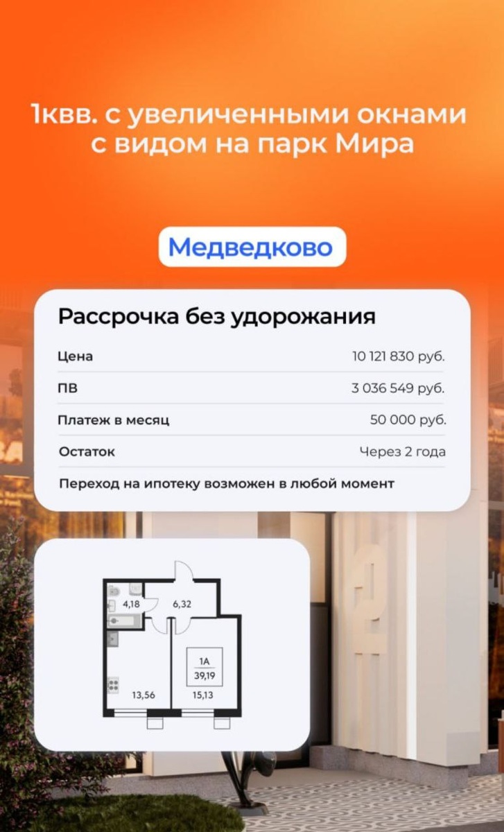 Рассрочка без удорожания ЖК Бархат.Сити от застройщика Global Development Условия: — ПВ от 20%, остаток через 2 года — Фикс. ежемесячные платежи — Возможен переход на ипотеку ⚪️ Пример расчета: 2ккв. 62.16 м² — 16 646 720 ₽ Подходит молодым семьям с детьми, которые ищут комфортное жилье в г. Мытищи. Отличный баланс между городским комфортом и спокойной атмосферой вблизи парка. ⚪️ Пример расчета: 1ккв. 39.19 м² — 10 121 830 ₽ Подходит представителям малого и среднего бизнеса, рассматривающие инвестицию в недвижимость. Для клиентов, реализующих свою недвижимость/держащих деньги на депозитах. ▶️ Преимущества проекта: — Один из развитых и экологически чистых районов Подмосковья — Отличная транспортная доступность по Ярославскому шоссе и близость к МКАД — Закрытый двор-сад — Развитая внутренняя инфраструктура (школа, детский сад, коммерция на первых этажах!