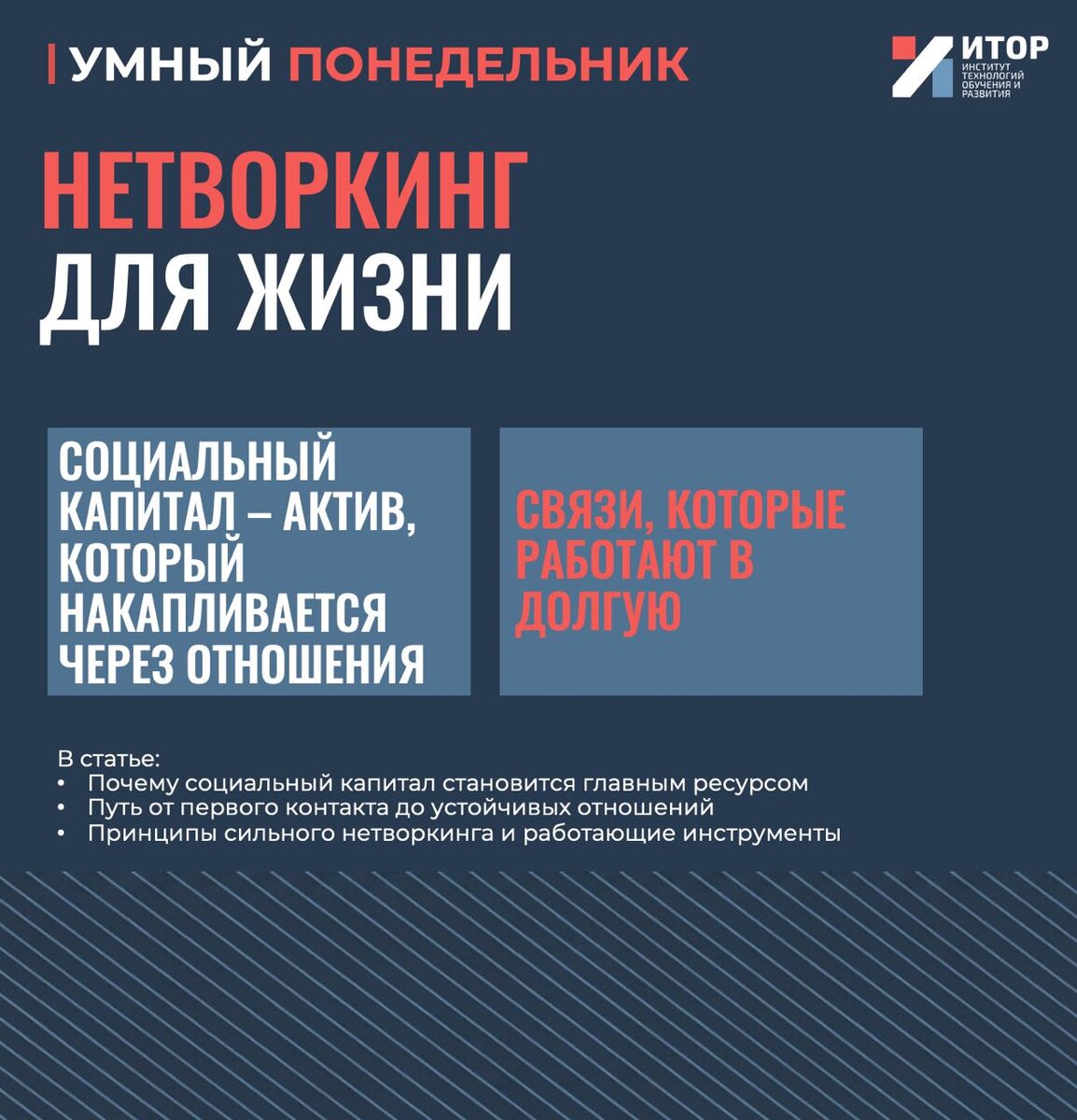 УМНЫЙ ПОНЕДЕЛЬНИК. НОВАЯ СТАТЬЯ Взрослая жизнь показывает простую закономерность: самые важные вещи мы получаем через людей, а не через случай. Но для многих нетворкинг до сих пор звучит как что-то сложное, неловкое или «не для меня». Новая статья объясняет, как выстраивать связи мягко, по-взрослому и естественно — без давления и без навязчивости. И главное — там есть важная мысль: нетворкинг — это не «пойти познакомиться», а процесс в долгую. Подготовка, первый контакт, общение, поддержание связи, регулярные касания — это целая система, благодаря которой мы остаёмся полезными и интересными друг другу, а не просто собираем визитки. Что ещё важного вы найдете внутри: 💾 Про социальный капитал. Почему после 30+ связи становятся таким же активом, как деньги и навыки. И что влияет на их качество. 💾 Про практичные лайфхаки. Не теория — а простые шаги «бери и применяй», которые помогают поддерживать отношения и расширять круг возможностей. 💾 Про нетворкинг для интровертов. Как