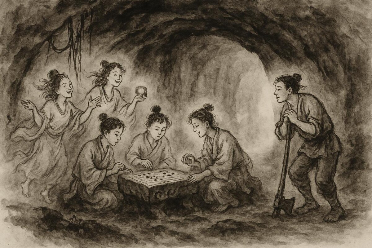 Искал оригинал легенды «Сгнившее топорище» и выяснил несколько любопытных деталей, которые не знал ранее. Легенда звучит так (в переводе chat gpt с китайского): «Во времена династии Цзинь в уезде Синъань, на горе Шиши, некий Ван Чжи рубил там лес. Подойдя к горе, он увидел нескольких юношей, которые играли в настольную игру и пели, и Ван Чжи стал слушать. Один из юношей дал Ван Чжи некий предмет, похожий на косточку финика; держа ее во рту, он не чувствовал голода. Через некоторое время юноша спросил дровосека: «Почему ты не уходишь?» Ван Чжи поднялся и увидел, что топорище его сгнило полностью. Когда он вернулся домой, не осталось уже людей его времени». Текст легенды появляется уже в трудах эпохи Южных и Северных династий (IV–VI века). Легенда стала символом вневременного характера Го: кажется, что во время партии может исчезнуть реальный мир. Гора "Гнилого топорища" находится в провинции Чжэцзян и там под сводом пещеры установлена гигантская доска Го. В классических описаниях