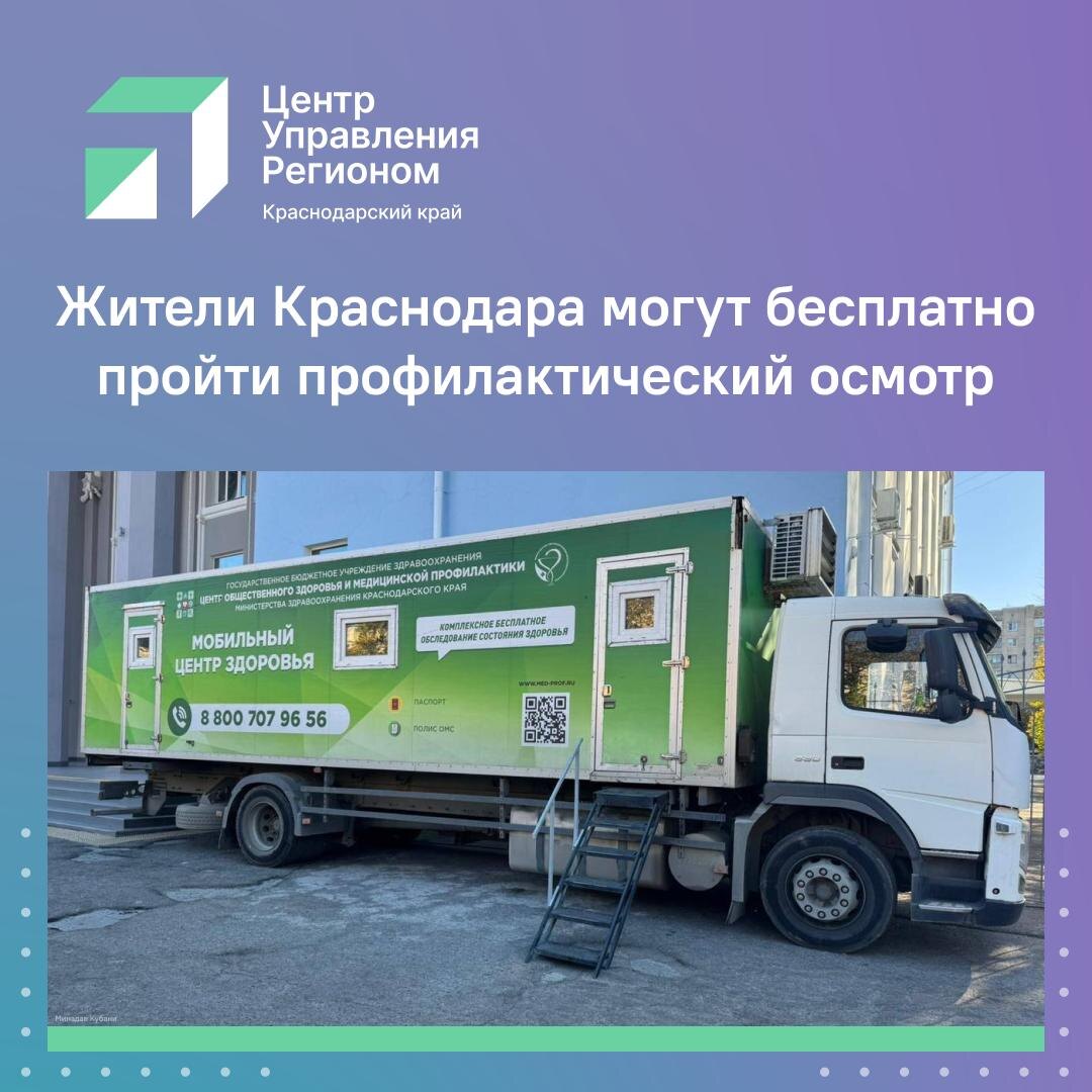 Бесплатный профилактический осмотр для жителей Краснодара! Любой желающий сможет узнать о состоянии физической формы, работе сердца и лёгких, уровне холестерина и глюкозы в крови, а также индексе массы тела. Для участия с собой необходимо взять паспорт и полис ОМС.