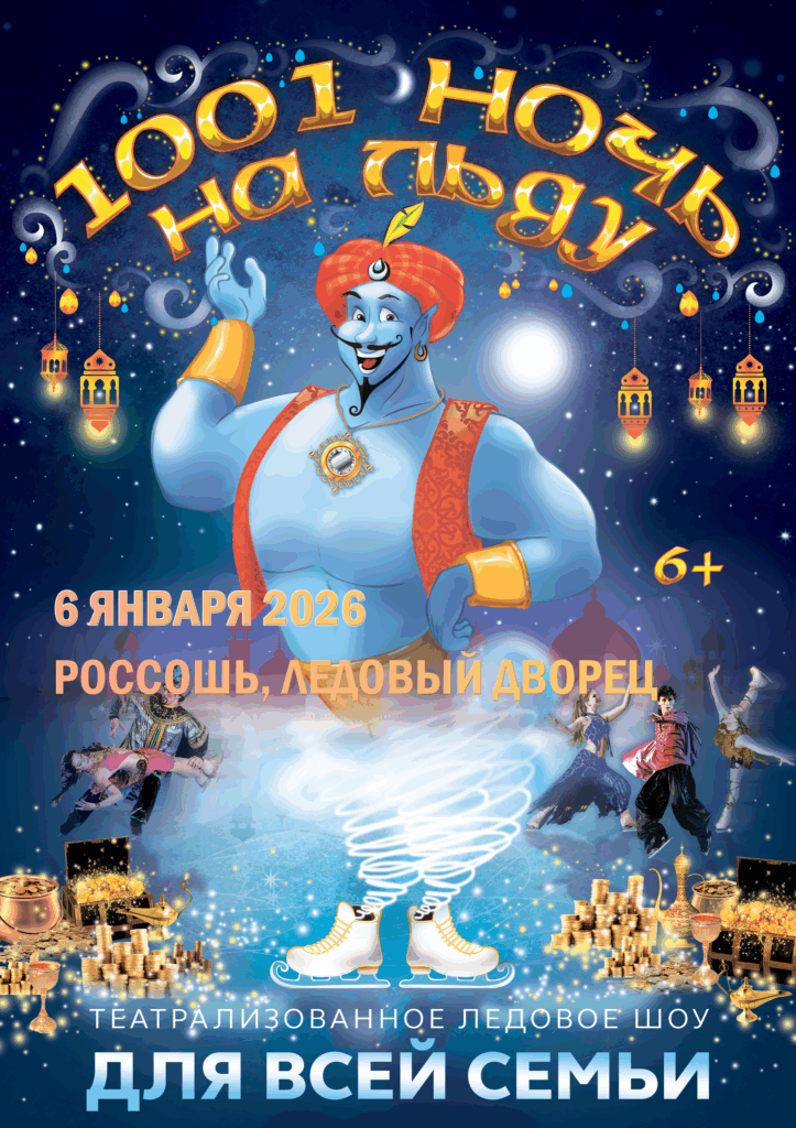 1001 ночь на льду . 6 января 2026 года в Россоши в Ледовом дворце .Начало в 16 часов. 6+ Дети до 3 лет бесплатно без предоставления места Если ввиду проблем с интернетом не получается онлайн купить билеты ,позвоните нам или напишите : +79586496909, +79155463934 и мы вам поможем.Или обратитесь в кассу ледового дворца. «Иногда нужно прожить сказку, чтобы понять, что это настоящая жизнь» Билеты и в кассе Ледового дворца -Россошь. Билеты по ссылке https://iframeab-pre10578.intickets.ru/seance/68294769/?bs_login Реклама ЕРИД CQH36pWzJq5WJG7dX5BqvvXwzYUBAKDRUB4kL75adBRqnu «1001 ночь на льду» - это яркое театрально-цирковое представление, в сюжете которого лежат известные всему миру сказки неповторимой рассказчицы Шахерезады. Зрители увидят приключения отважного юноши Аладдина, нашедшего волшебную лампу, с помощью которой можно загадывать любые желания; сказку об Али-Бабе, случайно ставшего свидетелем несметных сокровищ, хранящихся в пещере у 40-ка разбойников; морском путешественнике Си