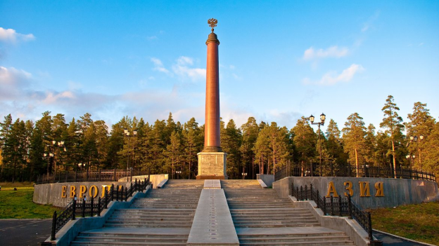 Новый обелиск на границе между Европой и Азией у горы Березовой на подъезде к г. Первоуральску. («Путеводитель по Свердловской области»)
