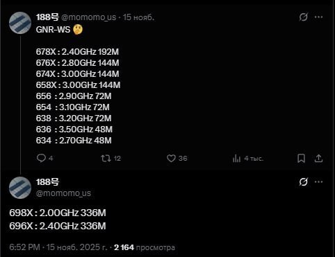 Intel готовит рабочие станции на базе Granite Rapids-WS. Утекшая спецификация Granite Rapids-WS включает более десяти моделей — от Xeon 634 до флагманских моделей 696X и 698X с кэшем до 336 МБ. Первый протестированный чип, инженерный Xeon 654, уже появился в Geekbench: 18 ядер, 32 потока, Boost до 4,77 ГГц, 72 МБ кеша L3. В тестах он набрал 2634 балла в одноядерном режиме и 14 743 в многоядерном, что сопоставимо с Core i7-13700 (2641 и 14493). Кроме того, Intel закрыла проект доступного 8-канального Diamond Rapids и оставила только 16-канальный вариант на платформе Oak Stream, выпуск которой намечен на 2026 год. Это связано с тем, что рынок всё больше ориентируется на большие объемы памяти и тяжелые конфигурации, из-за чего компактные серверные сокеты теряют актуальность. @techogid
