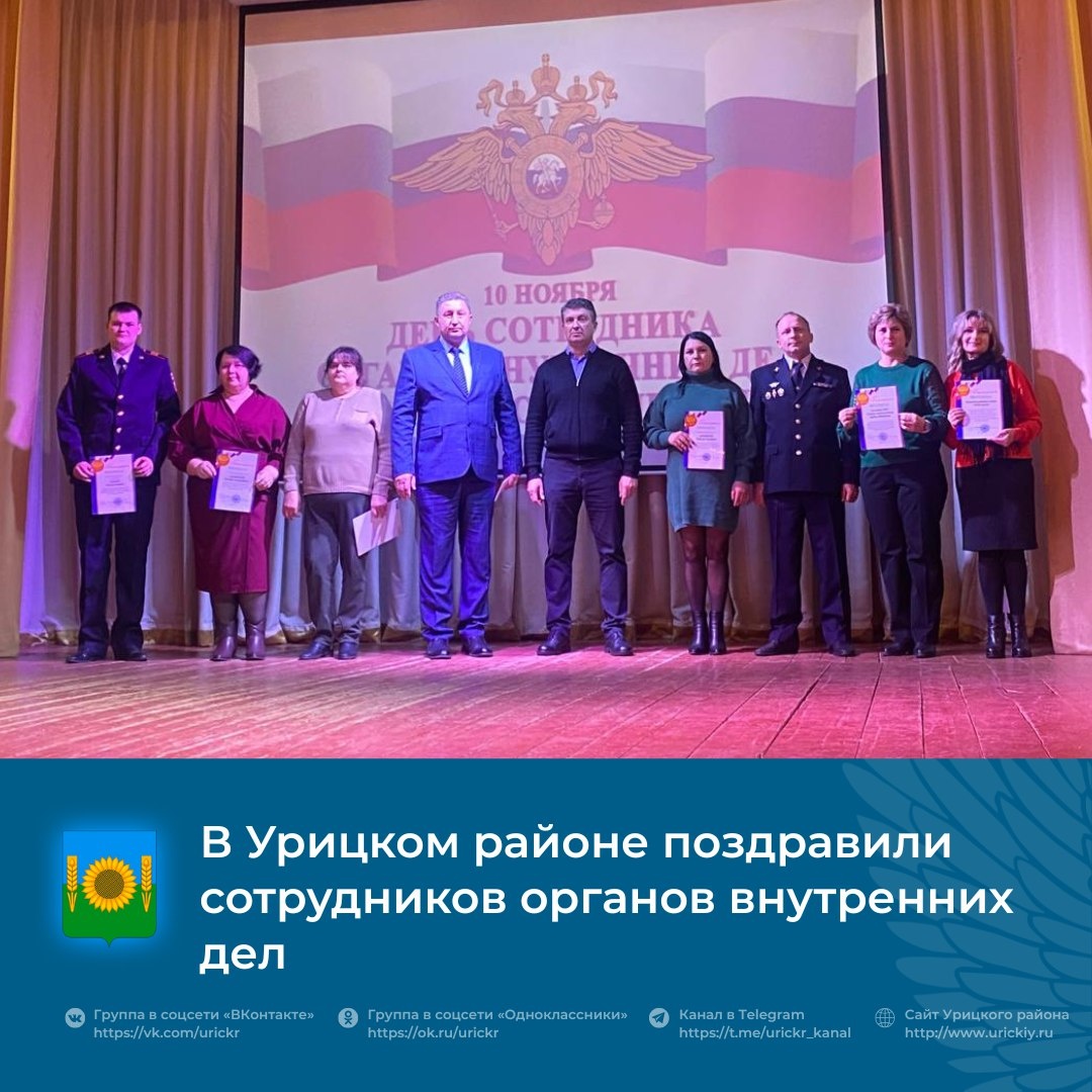 👮👏На прошлой неделе в Урицком Районном Доме Культуры состоялось яркое событие – чествование сотрудников органов внутренних дел Российской Федерации. Собравшихся поздравили представители районной и поселковой администрации, а также руководители ветеранской организации и местного отдела МВД. В рамках праздника прошла церемония награждения отличившихся сотрудников, отмеченных за свою службу. 💃🎤Концертную программу украсили выступления талантливых артистов. Особое внимание зрителей привлек ансамбль танца «Молодость», руководимый Заслуженным работником культуры РФ Галиной Михалевой. Также свои номера представили солисты Ольга Черняк, Дарья Таничева, Кира Мишонкова, Алина Новикова и Андрей Поздеев. Музыкальное сопровождение вечера дополнил Тимур Саяпин. Мероприятие прошло в атмосфере искреннего уважения и признательности к нелегкому труду сотрудников правопорядка, подчеркнув их преданность делу служения закону и обществу. #УрицкийРайон #АдминистрацияУрицкогорайонаОрловскойобласти