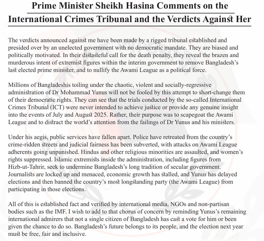 В ответ на пост ⚡️‘Rigged tribunal’ — Ex-PM Sheikh Hasina slams Bangladesh ICT’s verdict ‘Distasteful call for the death penalty’ ‘They reveal the brazen and murderous intent of extremist figures within the interim government to remove Bangladesh’s last elected prime minister’