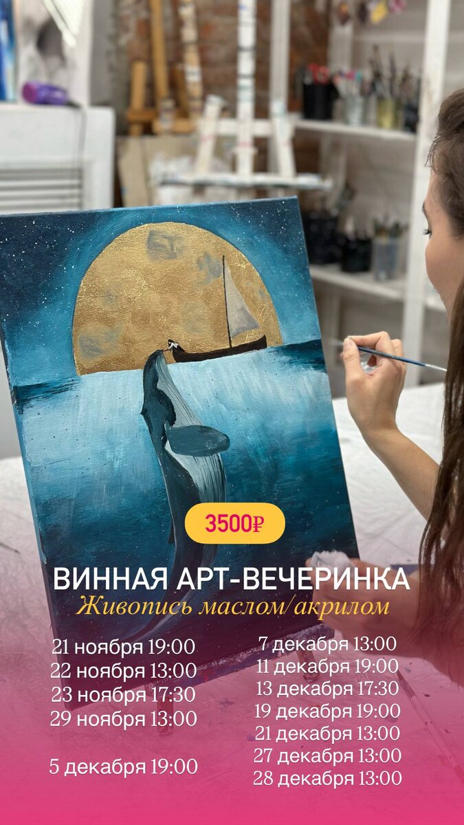 💗💗💗💗💗💗💗💗💗💗 Ноябрь - декабрь И у нас появился новогодний мастер-класс и даже два ❄️ Винная арт-вечеринка (Здесь мы собрали огромную подборку новогодних и рождественских картин) ❄️ Рождественские венки Это был фурор в прошлом году и поэтому в этом году мы его повторяем и делаем в два раза больше уроков Венки созданы полностью из натуральной ели 🌲, сорта которая не осыпается и останется с вами в первозданном виде 🌸Все уроки будут проходить с шампанским, загадыванием желаний на листочках и поджиганием, вкусными мандаринами и праздничным настроением 💗💗💗💗 Указаны без учета скидки 25% Забронировать место или подарочный сертификат по скидке можно тут 👉🏼 написать менеджеру