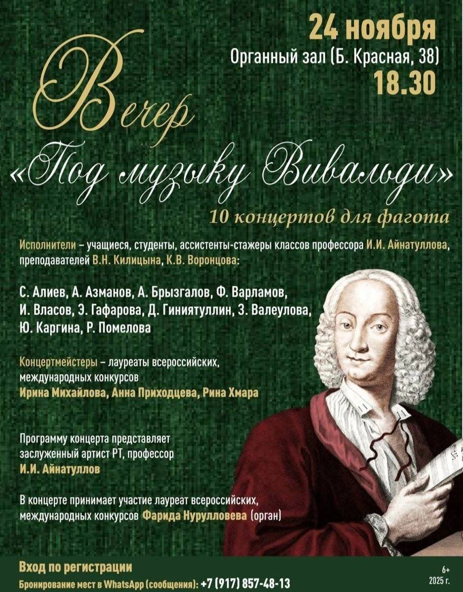 24 ноября в 18:30 в Органном зале Казанской консерватории состоится концерт «Под музыку Вивальди». В программе – выступления учащихся, студентов и ассистентов-стажёров классов профессора И. И. Айнатуллова, преподавателей В. Н. Килицыной и К. В. Воронцовой. Вход по регистрации, бронь мест по сообщению в WhatsApp: +7 (917) 857-48-13. 📍ул. Большая Красная, 38 @kazandetki Больше информации в нашей группе, переходите