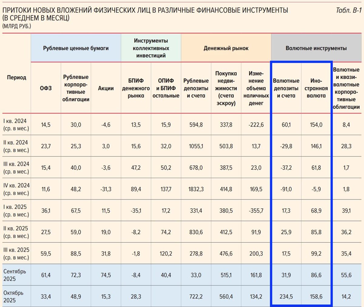 В ответ на пост Админ полез посмотреть свежий документ Центробанка — обзор рисков финансовых рынков (табличку оттуда и взял). ➡️Я выделил для вас синим столбики, куда нужно смотреть. Нас интересует октябрь (позже объясню почему). Как видно из графиков, в валютные инструменты пришёл большой приток со стороны физических лиц. Россияне в октябре 2025 года приобрели валюту на 158,6 млрд руб. Это максимальный месячный объём чистых покупок валюты населением с мая 2024. Народ побежал в валютные депозиты и инструменты. Спрос на валюту шёл и со стороны юриков. ................................................. Скорее всего этот немалый спрос вызван сигналом Центробанка на последнем заседании по ключевой ставке. По факту сигнал был мягкий — и ключевая фраза: мы в цикле снижения ставки. То есть, хоть снижение и было только на 0,5 п.п., Центробанк дал понять, что будет снижать дальше. ➡️Поэтому рублевые депозиты всё ещё выглядят привлекательно, но при дальнейшем снижении ключевой ставки на 1–2 п