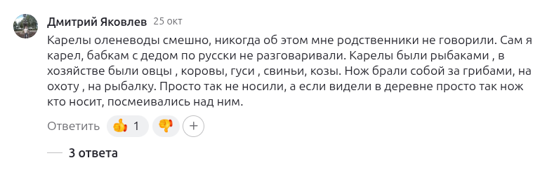 В статье я написала, что карелы (и поморы, кстати), занимались оленеводством. В комменты пришел подписчик, охарактеризовавшийся карелом, и заявил, что ему смешно от мысли, что карелы занимались оленеводством. Ему смешно, а мне печально. Бесит, что люди, прочитав что-то неожиданное для себя, не пытаются этого уточнить в интернете, в других источниках, а льют на голову автору. Тут еще комментарий вежливый, а многие сразу с оскорблений заходят. Я понимаю, ему хочется показать себя умным. Но срабатывает ли такой подход? Ну проверь сначала, а вдруг занимались карелы оленеводством. Просто допусти, что ты не пуп вселенского интеллекта, и можешь чего-то попросту не знать. Это же тебя самого разовьет, а также и расширит твои знания. То, что ты карел, не делает тебя автоматически обладателем всех знаний о карелах (также как я не знаю всего о русских). То, что ты живешь в Карелии, тоже не наделяет тебя автоматически всем комплексом знаний о регионе. Я вот сама когда-то не знала, что северные русс