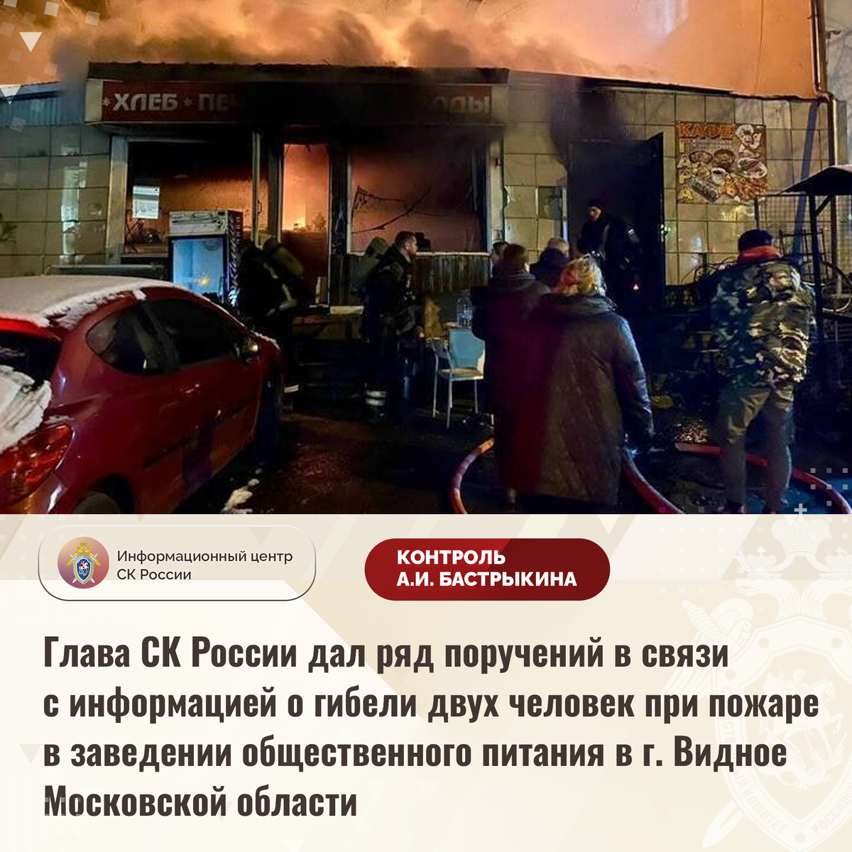 Глава СК России дал ряд поручений в связи с информацией о гибели двух человек при пожаре в заведении общественного питания в г. Видное Московской области В телеграм-канале сообщается, что в ноябре текущего года в помещении кафе в городе Видное Московской области произошло возгорание. В результате два человека скончались на месте, еще двое пострадавших доставлены в медицинское учреждение с ожогами и отравлением продуктами горения. Отмечается, что заведение функционировало нелегально, рядом с ним расположен незаконный хостел. В ГСУ СК России по Московской области возбуждено уголовное дело по признакам преступления, предусмотренного ст. 109 УК РФ (причинение смерти по неосторожности). Также в региональном следственном управлении по факту халатности должностных лиц органов МВД России организована процессуальная проверка. Председатель Следственного комитета Российской Федерации Александр Иванович Бастрыкин поручил руководителю ГСУ СК России по Московской области Ярославу Александровичу Яко