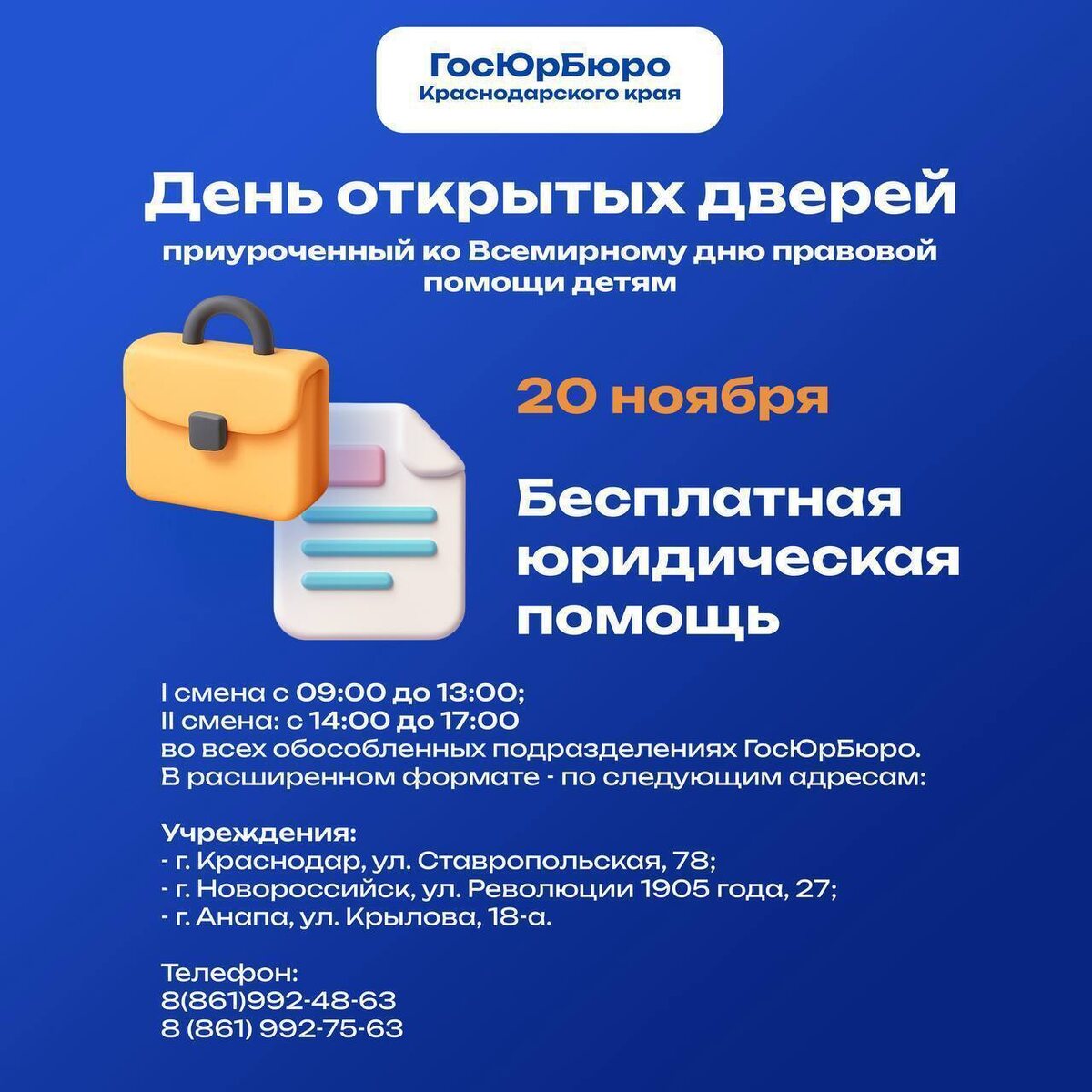ГосЮрБюро Кубани проводит День открытых дверей ⏱Прием граждан пройдет 20 ноября 2025 года с 09.00 до 17.00 часов во всех обособленных подразделениях. 👨🏻🎓 На личном приеме посетители получат ответы на интересующие их вопросы правового характера, в том числе о мерах социальной поддержки. ➡️С подробной информацией можно ознакомиться здесь (https://clck.ru/3QMWvB) # ГосЮрБюро