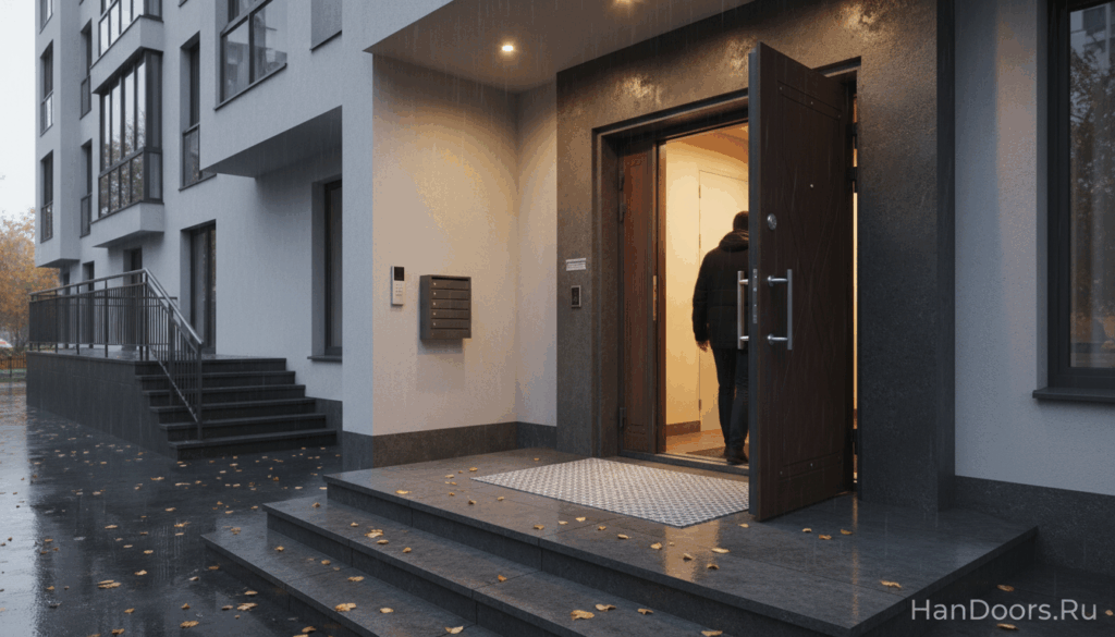 - Посмотрите на дверь: Оцените толщину дверного полотна и наличие броненакладок. Если полотно «играет» или броненакладка легко снимается отвёрткой — это тревожный сигнал.