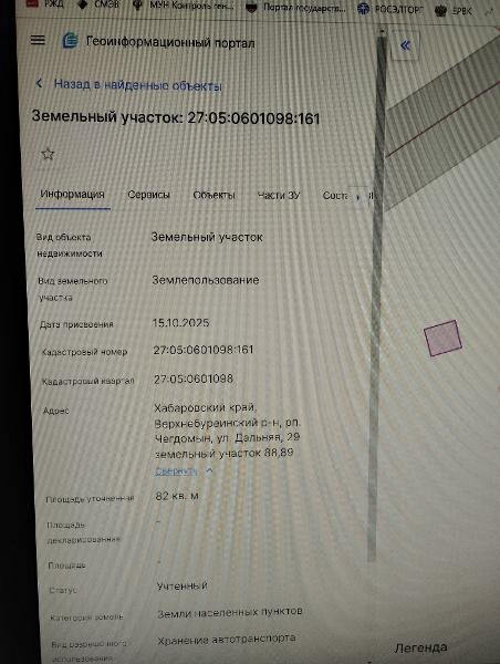 Название: Лот № 1, земельный участок с кадастровым номером 27:05:0601098:161, площадью 82,0 кв. м., расположенный по адресу: Российская Федерация, Хабаровский край, Верхнебуреинский муниципальный район, Городское поселение Рабочий поселок Чегдомын, Рабочий поселок Чегдомын, улица Дальняя, 29, земельный участок 88,89, вид разрешённого использования – хранение автотранспорта Канал: Госземля Хабаровский край Область: край Хабаровский Район: м.р-н Верхнебуреинский Населенный пункт: г.п. рабочий поселок Чегдомын, рп Чегдомын, ул Дальняя Локация: Смотреть на карте ВРИ: Хранение автотранспорта Кадастровый номер: 27:05:0601098:161 Кадастровая стоимость: - Вид сделки: Аренда Площадь: 82 м² Начальная цена: 4136.00 руб. Дата завершения: 26.11.2025 Подробнее: ГИС ТОРГИ #госземля #земляотгосударства #земля #земельныйучасток #земельныеторги #торги #аукцион #арендаземли #аренда #хабаровскийкрай