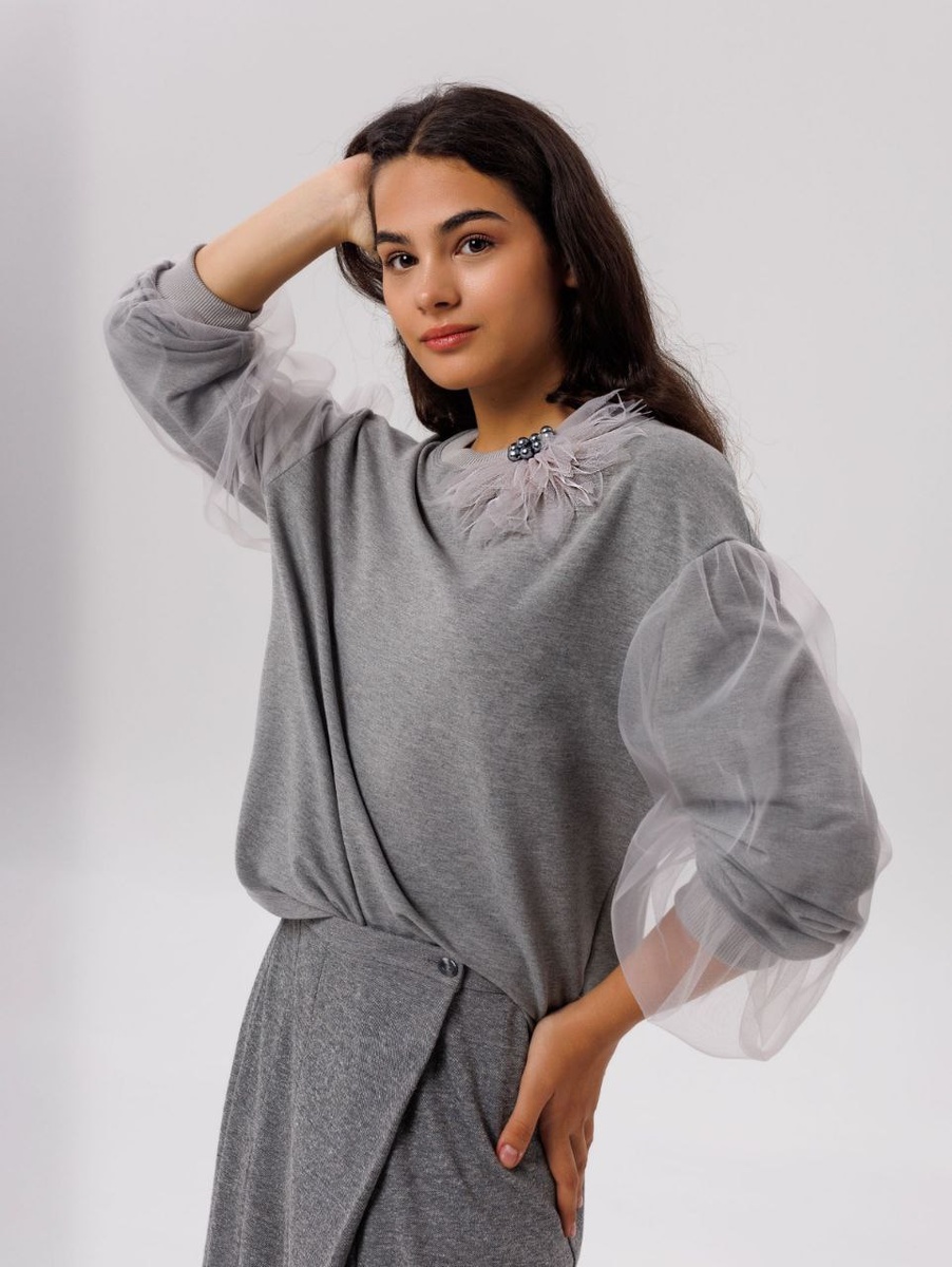 Серый меланжевый джемпер с дизайнерскими элементами. Нестандартный вариант для любого дня. И праздничного вечера.