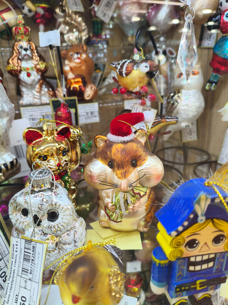 Я вообще категорически против появления новогодних украшений еще аж в октябре. Все знаю про маркетинговые ходы - на точке тоже уже появились шарики и мишура, - но для себя это отношу к выхолащиванию ожидания праздника - оно не должно длиться неделями и превращаться в рутину. Очень люблю Новый год поэтому у себя дома - никаких гирлянд до второй половины декабря , а елка вообще в последний момент. Но тут я не удержалась ))) Пробегала в субботу на Семеновской по ТЦ и наткнулась на большой развал елочных шариков. Настоящих, стеклянных. И залюбовалась!... (А потом офигела от цен, еще год назад такого не было!..) В общем, делюсь, вдруг кому надо. Этот хома поразил меня в самую пятку, ну милота же ))) Люблю грызунов. ПуНдель. Собачек разных мастей и пород тоже есть в количестве. О существовании шелтей, как водится, тут тоже никто ничего не знает. (И после такого ценника корги из Перекрестка за 399 уже не кажется мне дорогущим). И всякое прочее зверье. Змеи сдают позиции, потому они п