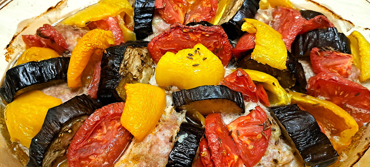 Тава-кебаб - нежное и сочное мясо с ароматными запеченными овощами. Главное - приготовить вкусный фарш, нарезать овощи и разогреть духовку. Все готовится в одной форме, мясные котлетки пропитываются соками овощей, а кухня наполняется ароматами восточных специй. Когда гости неожиданно заглядывают на огонек, этот рецепт позволяет быстро создать гостеприимную атмосферу турецкой трапезы — сытно, ярко и без лишних хлопот. Фарш для тава-кебаб готовим по своим предпочтениям, у меня - из индейки. Продукты: Фарш мясной - 400 г Лук репчатый - 1 шт. Масло растительное - 3 ст. л. Паприка молотая - 1 ч.л. Зира - 0,5 ч.л. Перец черный молотый - по вкусу Соль - по вкусу Баклажаны - 2 шт. Перец сладкий - 1 шт. Помидоры - 2 шт. Вода - 150 мл В мясной фарш добавить измельченный лук. Посолить и поперчить, добавить паприку. Сформировать продолговатые котлетки. Сладкий перец нарезаю крупными кусками Баклажаны по классике режут очень большими кусками, поперёк на 2-3 части (в зависимости от размера овощей