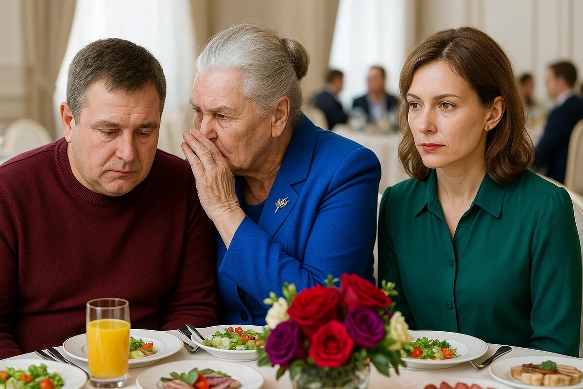Слева от меня Виктор, справа — его мать, Зинаида Петровна. Она в синем костюме с брошкой, спина прямая, губы поджаты. Каждую минуту поправляет салфетку на столе, будто я её неправильно положила.