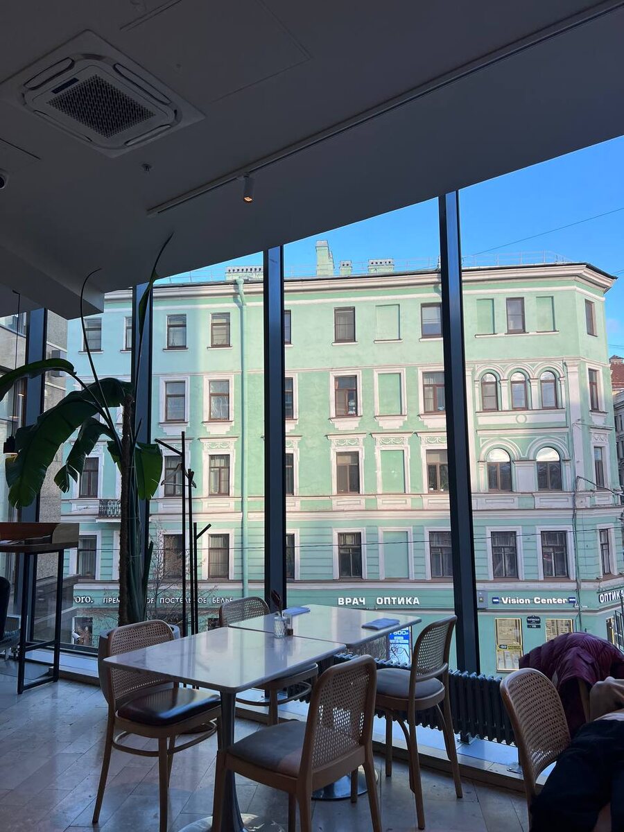 В этом ресторане нет суеты и случайных людей. Он как будто сразу приглашает не спешить. Двухэтажный ресторан и шикарный панорамный вид за счет окон в пол. Я бы выбрала это место для Листайте галерею: там виды из окон и интерьер Есть крупный овальный стол для группы до 6-10 человек. В тот период времени, когда я была в ресторане, сюда часто заглядывали дамы "серебряного" возраста с подружкой — на завтрак или обед. Большие окна решают все! А еще решают белые скатерти и льняные салфетки — сразу виден высокий уровень заведения, отделка деревом и элементы отделки с отсылкой к Древнему Риму (колонна с пилястром). Можно уютно расположиться в глубине ресторана на мягких диванчиках, а можно сесть за столик у окна и наслаждаться прекрасной архитектурой Петроградки с высоты 3-4 этажа. На каждом столике ваза с живым цветком — что тоже добавляет настроения и приятности. Здесь создано пространство, где комфортно тихо говорить, можно наслаждаться панорамным видом и никуда не торопиться. Во всех