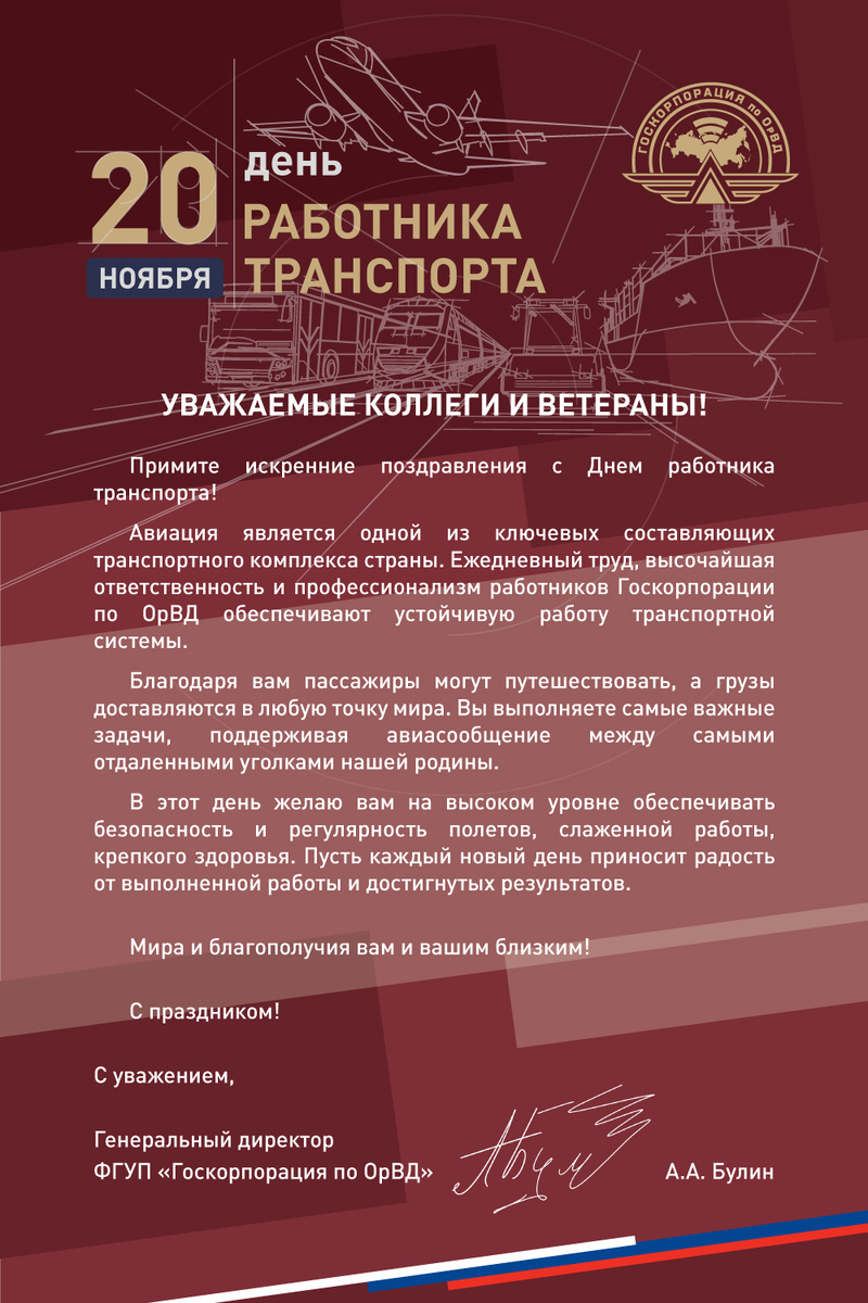 Благодаря вам, уважаемые коллеги, пассажиры могут путешествовать, а грузы доставляются в любую точку мира. Вы выполняете важные задачи, поддерживая авиасообщение между самыми отдаленными уголками нашей родины. С праздником!